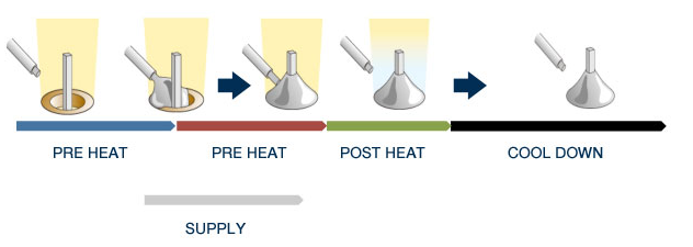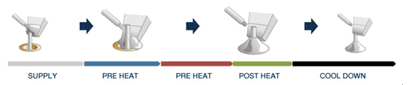激光焊锡和机器人烙铁焊锡的工序都是分为进行预热、为提供焊锡时的加热和提供焊锡后成型时的后加热3个基本步骤。虽然机器人烙铁焊锡和激光焊锡的基本工序相同,但提供加热焊锡的方法不同。理解这点至关重要。(如下图)