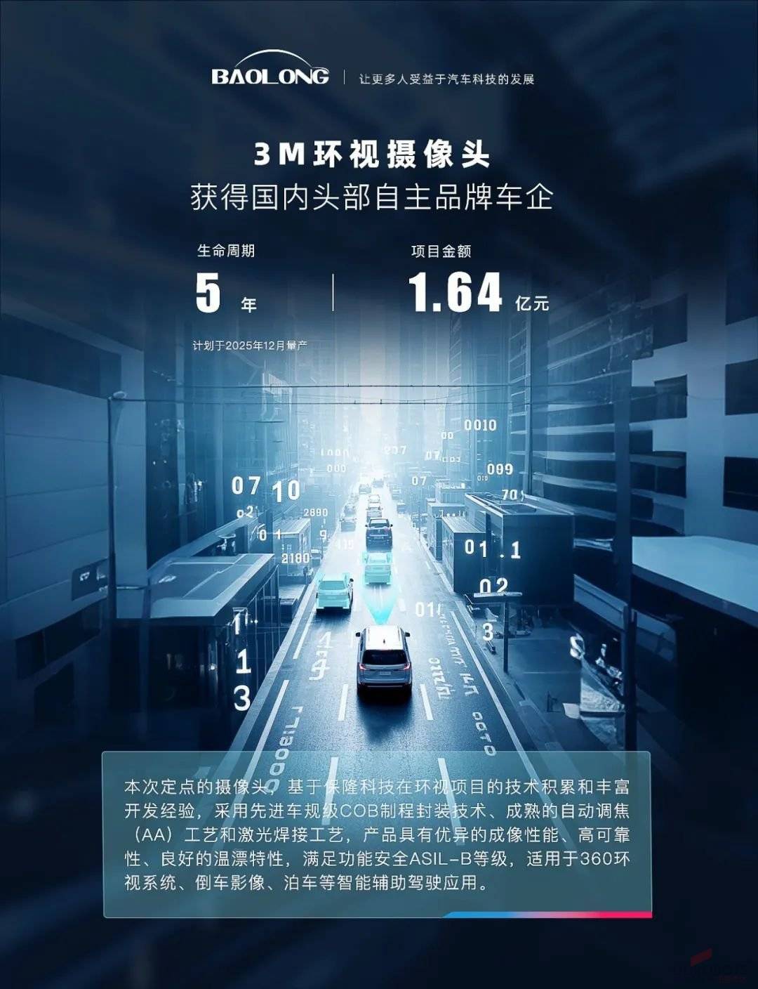 近日,保隆科技成功获得国内头部车企的3M环视摄像头项目定点,生命周期总金额达1.64亿元,标志着其在智能驾驶视觉领域的领先地位。该项目的摄像头采用先进的自动调焦(AA)工艺,确保产品具备优异的成像性能与高可靠性,满足功能安全ASIL-B等级要求。作为激光工艺创新领域的先锋,ULiLASER将深度参与保隆科技AA工艺的优化与升级,为环视摄像头的高精度制造提供核心技术支持。